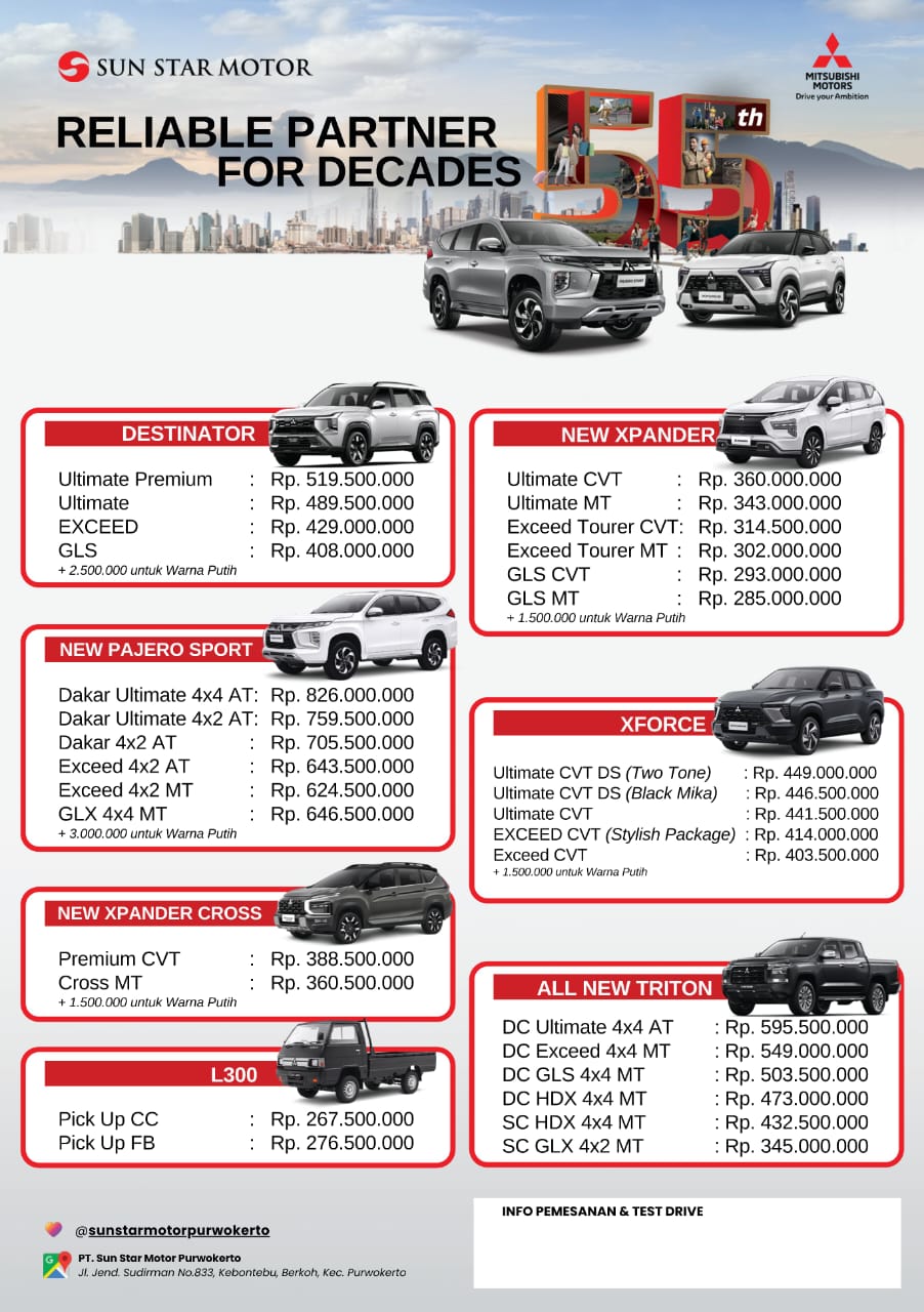 Tanyakan kepada sales mitsubishi kebumen mengenai update harga terbaru yang berlaku di bulan Maret 2026 agar anda mendapatkan harga yang kompetitif, dan juga tanya tentang promo yang berlaku pada bulan Maret 2026 agar anda mempertimbangkan kapan mau membeli mobil dengan menunggu promo terbaik tentunya.