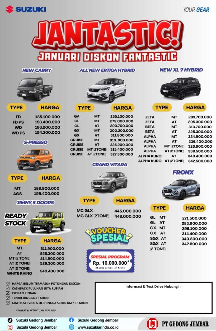 Tanyakan kepada sales suzuki batang mengenai update harga terbaru yang berlaku di bulan Maret 2026 agar anda mendapatkan harga yang kompetitif, dan juga tanya tentang promo yang berlaku pada bulan Maret 2026 agar anda mempertimbangkan kapan mau membeli mobil dengan menunggu promo terbaik tentunya.